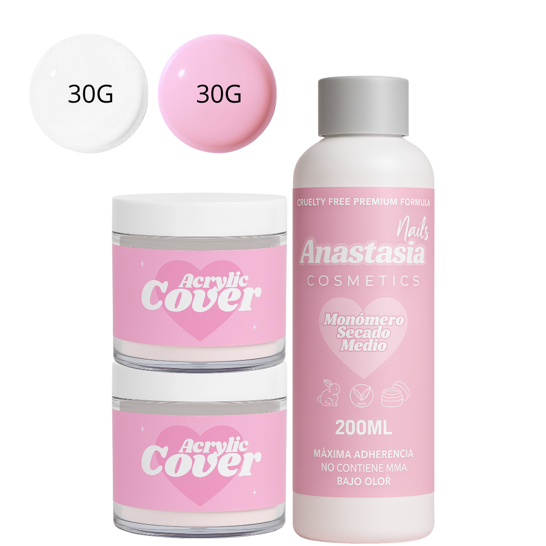 • 2 ACRÍLICOS DE 30G (COVER PINK Y COVER CLEAR) → TEXTURAS MANTEQUILLOSAS, FÁCILES DE TRABAJAR Y CON UN ACABADO SÚPER NATURAL.