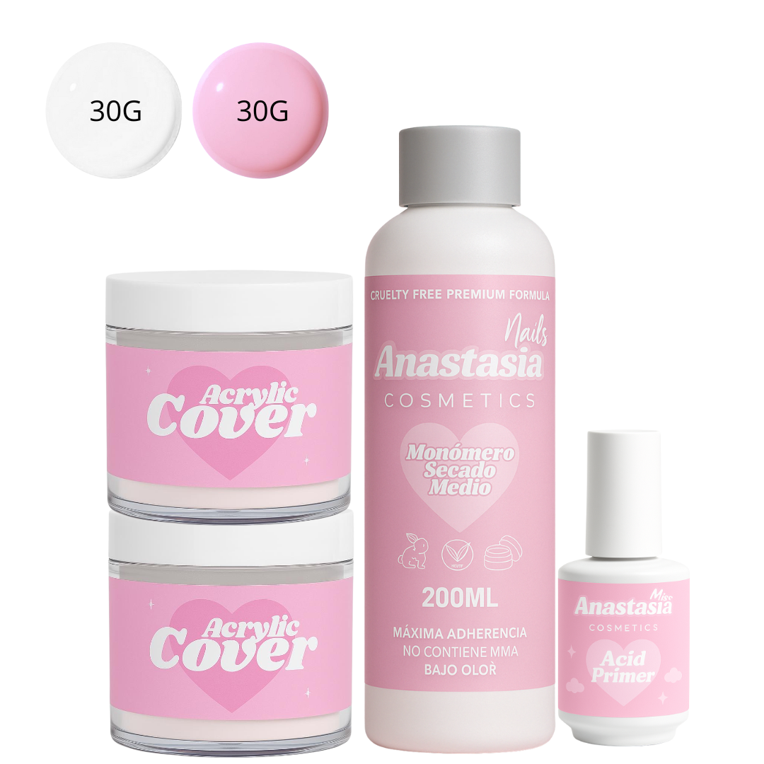 • 2 ACRÍLICOS DE 30G (COVER PINK y COVER CLEAR) → TEXTURAS MANTEQUILLOSAS, FÁCIL DE TRABAJAR Y CON UN ACABADO SÚPER NATURAL.